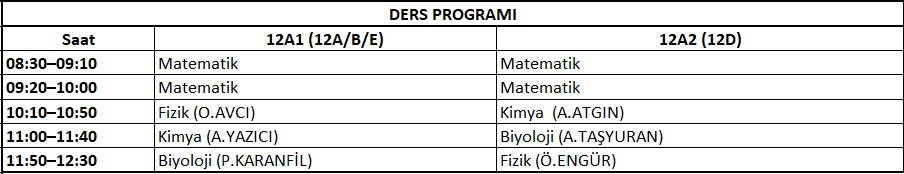 12. Sınıflar Hızlandırma Kursu Programı (19-23 Ocak 2026)